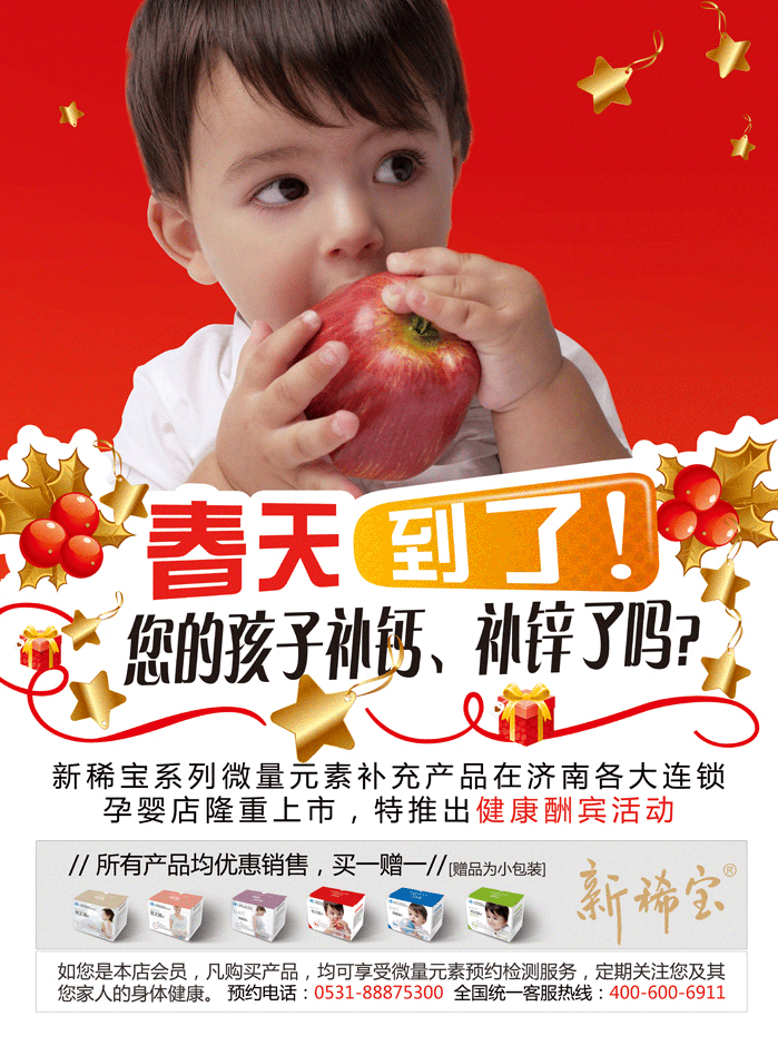 新稀寶系列微量元素補充產(chǎn)品在濟南疙瘩連鎖孕嬰店隆重上市,特推出健康酬賓活動。新稀寶牌鋅硒寶片兒童裝/孕婦裝,體恒健牌鈣之緣片兒童裝/孕婦裝,體恒健牌鐵之緣片兒童裝/孕婦裝優(yōu)惠活動買一贈一,凡購買產(chǎn)品者均可享受微量元素預(yù)約免費檢測服務(wù)。新稀寶全國客服統(tǒng)一熱線:400-600-6911。
