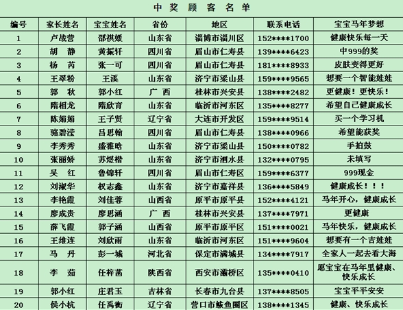 下面是中獎(jiǎng)人員名單及寶寶馬年夢(mèng)想: