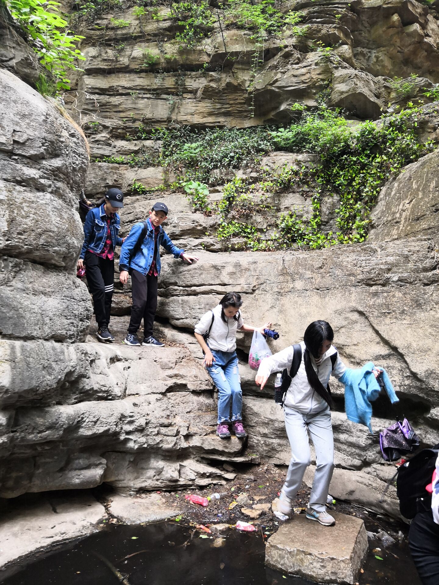 大家一路說(shuō)說(shuō)笑笑,很快就到了藏龍澗。藏龍澗地勢(shì)較低,長(zhǎng)數(shù)公里,開(kāi)闊處寬數(shù)丈,緊窄處伸兩臂幾可摸到兩側(cè)峭壁,兩側(cè)如刀劈斧削,最高處逾百米。因特殊的地理結(jié)構(gòu),山谷里的風(fēng)聲低沉如龍呤而得名。我們到達(dá)藏龍澗時(shí)正好下起了淅淅瀝瀝的小雨,伴著小雨徒步,別有一番滋味。不過(guò)這也給我們的行程增加了難度,因?yàn)榇颂帋r石較多,經(jīng)過(guò)雨水的沖刷變得十分光滑,再加上道路都是未經(jīng)修葺的,所以很多地方行進(jìn)的比較艱難。大家互相攙扶小心翼翼地行走,還有眾多熱心驢友的幫助,最終順利走過(guò)了最難的一段路。雖然過(guò)程中特別緊張害怕,但大家依舊興致不減,看看我們走過(guò)的路,心底滿是征服險(xiǎn)峻,突破自我的自豪感和成就感,也為我們的徒步之旅增色不少。