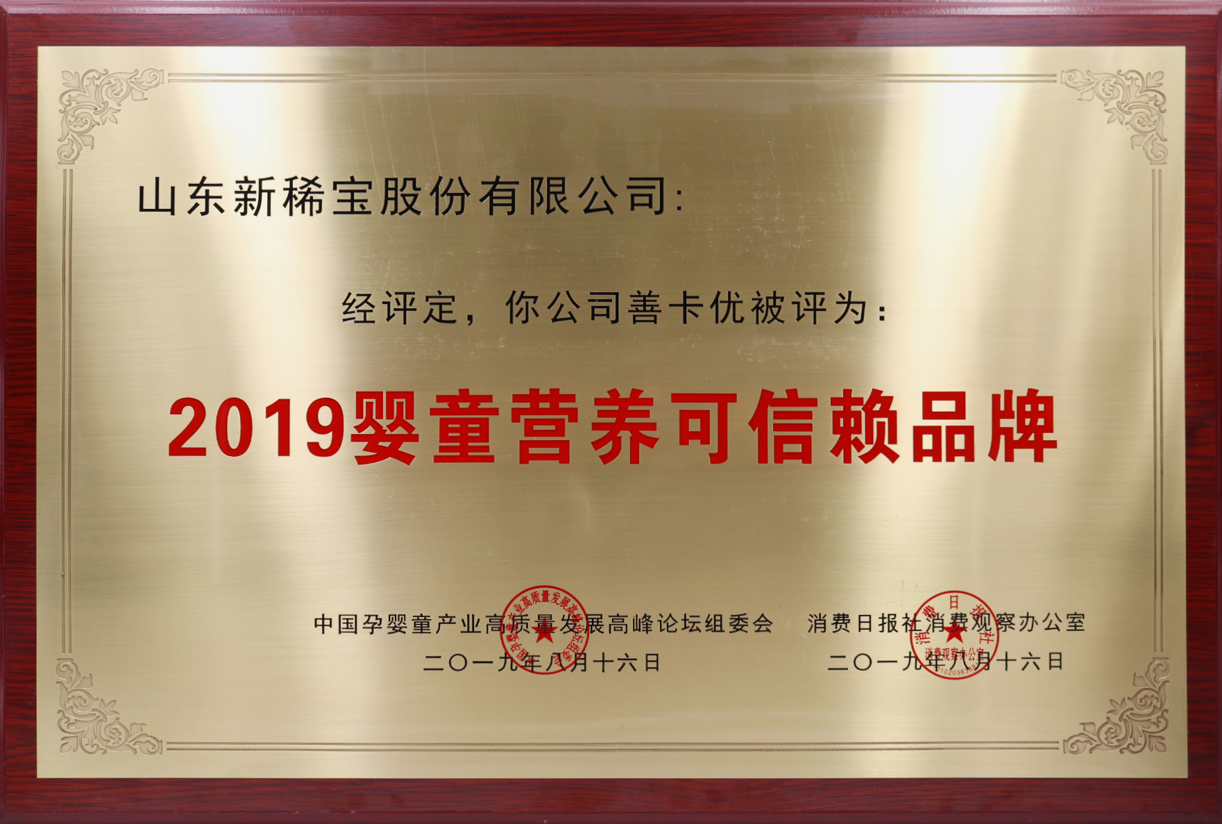 2019年8月 “善卡優(yōu)”被消費日報、中國孕嬰童產(chǎn)業(yè)高質(zhì)量發(fā)展高峰論壇組委會評為“2019嬰童營養(yǎng)可信賴品牌”