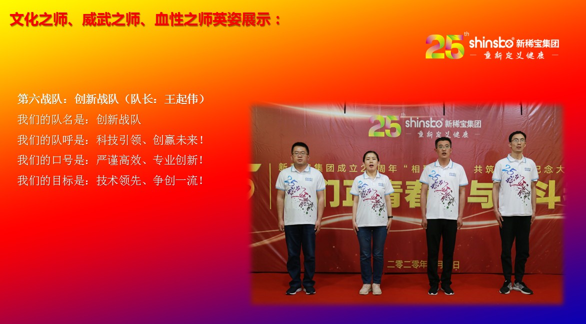 在文化儀式后緊接著舉行了隆重的“文化之師、威武之師、血性之師” 誓師大會(huì)。各戰(zhàn)隊(duì)步入會(huì)場就被熱烈的現(xiàn)場氛圍所感染,主屏展架抒寫“25我們正青春”與奮斗者同行的格言,大紅背景墻點(diǎn)綴出新稀寶集團(tuán)“相聚攜手 共筑百年”25周年紀(jì)念大會(huì)”活動(dòng)主題,兩條大氣宏偉、耀眼奪目橫幅 “增強(qiáng)緊迫感、聚焦主戰(zhàn)場、打好翻身仗;抓住新機(jī)遇、創(chuàng)造新優(yōu)勢、再創(chuàng)新輝煌”為誓師大會(huì)營造了良好戰(zhàn)斗氛圍,使各戰(zhàn)隊(duì)、各戰(zhàn)將從視覺上、思想上、感知上,感受到公司的凝聚力、向心力、變革力、戰(zhàn)斗力。