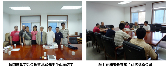 3、2008年6月9日,韓國(guó)艮齋學(xué)會(huì)會(huì)長(zhǎng)梁承武先生一行二人至山東訪學(xué),山東大學(xué)儒學(xué)研究中心、山東師范大學(xué)齊魯文化研究中心、山東省社會(huì)科學(xué)院儒學(xué)研究所、中國(guó)孔子基金會(huì)、濟(jì)南市傳統(tǒng)文化研究會(huì)相關(guān)人員就儒學(xué)在中國(guó)的現(xiàn)狀等問(wèn)題與梁先生進(jìn)行了深入的交流。