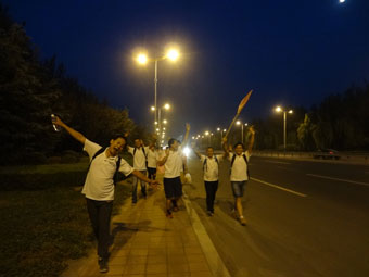 夜晚的秋風(fēng),帶著一絲絲的涼意,寬廣的馬路,自東向西一路延伸,每個(gè)人的臉上都充滿了興奮和激動(dòng),以及對(duì)完成目標(biāo)的自信。各小組在隊(duì)長的帶領(lǐng)下,沿著經(jīng)十路一路向西,途中,大家恣意高歌、暢談,相互鼓勵(lì)著,相互支持著,整個(gè)隊(duì)伍呈現(xiàn)出一派激情昂揚(yáng)、其樂融融的美好氛圍。約兩個(gè)小時(shí)后,各小組陸續(xù)到達(dá)第一集結(jié)點(diǎn)——孫村新區(qū),后勤支持人員為大家準(zhǔn)備了脈動(dòng)飲料,隨風(fēng)飄揚(yáng)的“突破旅”大旗點(diǎn)燃了大家的激情。