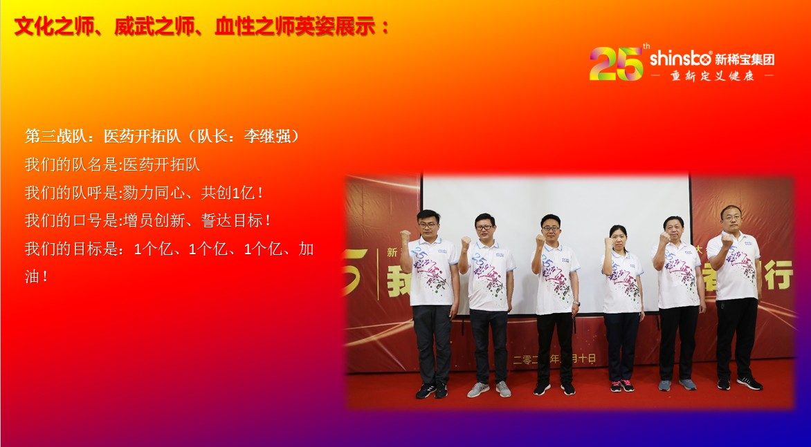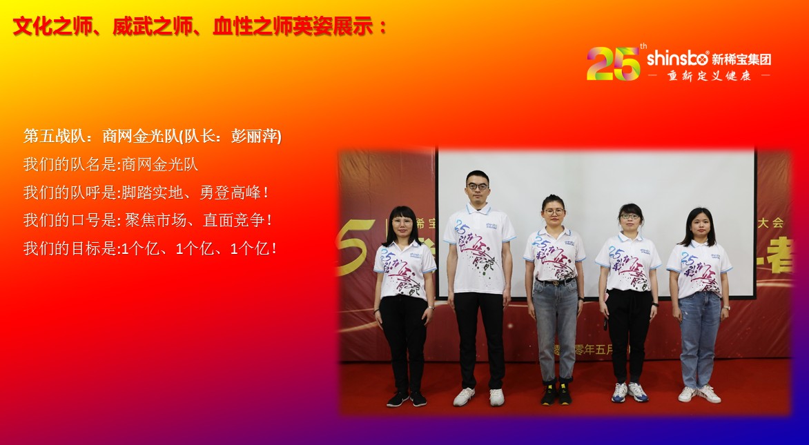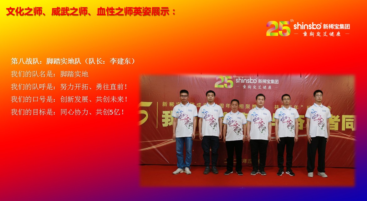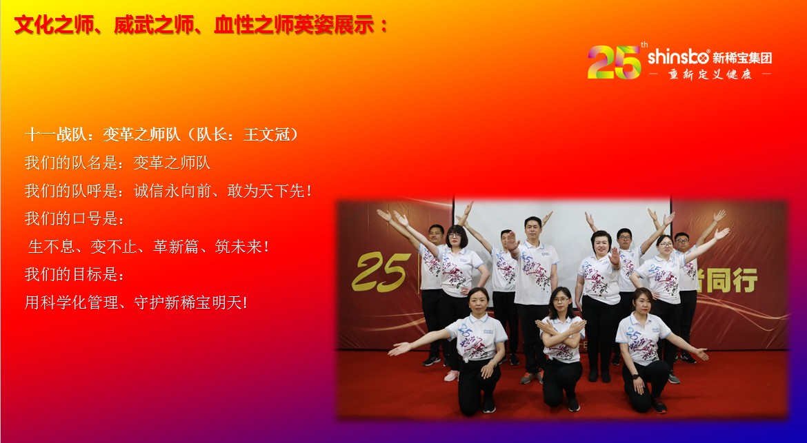 在文化儀式后緊接著舉行了隆重的“文化之師、威武之師、血性之師” 誓師大會(huì)。各戰(zhàn)隊(duì)步入會(huì)場就被熱烈的現(xiàn)場氛圍所感染,主屏展架抒寫“25我們正青春”與奮斗者同行的格言,大紅背景墻點(diǎn)綴出新稀寶集團(tuán)“相聚攜手 共筑百年”25周年紀(jì)念大會(huì)”活動(dòng)主題,兩條大氣宏偉、耀眼奪目橫幅 “增強(qiáng)緊迫感、聚焦主戰(zhàn)場、打好翻身仗;抓住新機(jī)遇、創(chuàng)造新優(yōu)勢、再創(chuàng)新輝煌”為誓師大會(huì)營造了良好戰(zhàn)斗氛圍,使各戰(zhàn)隊(duì)、各戰(zhàn)將從視覺上、思想上、感知上,感受到公司的凝聚力、向心力、變革力、戰(zhàn)斗力。